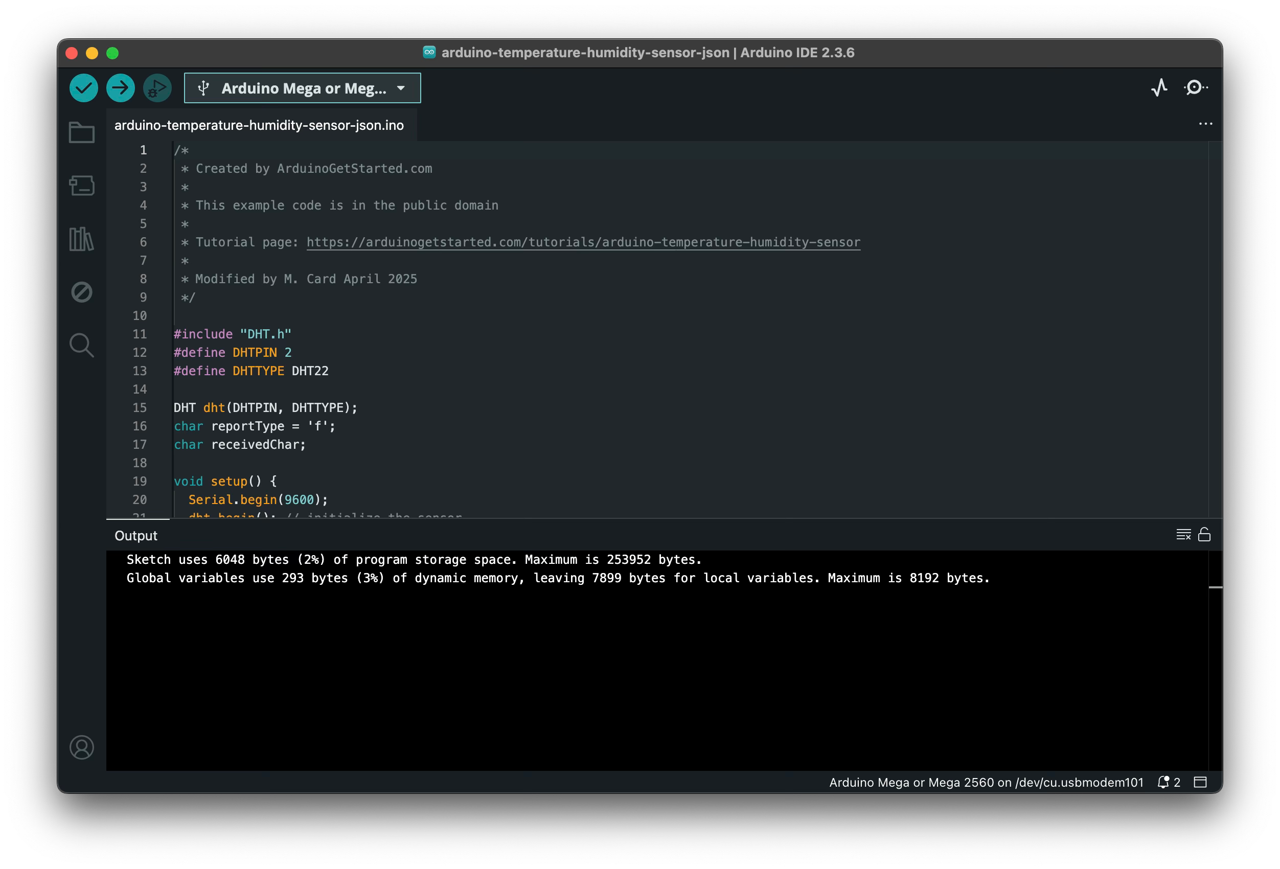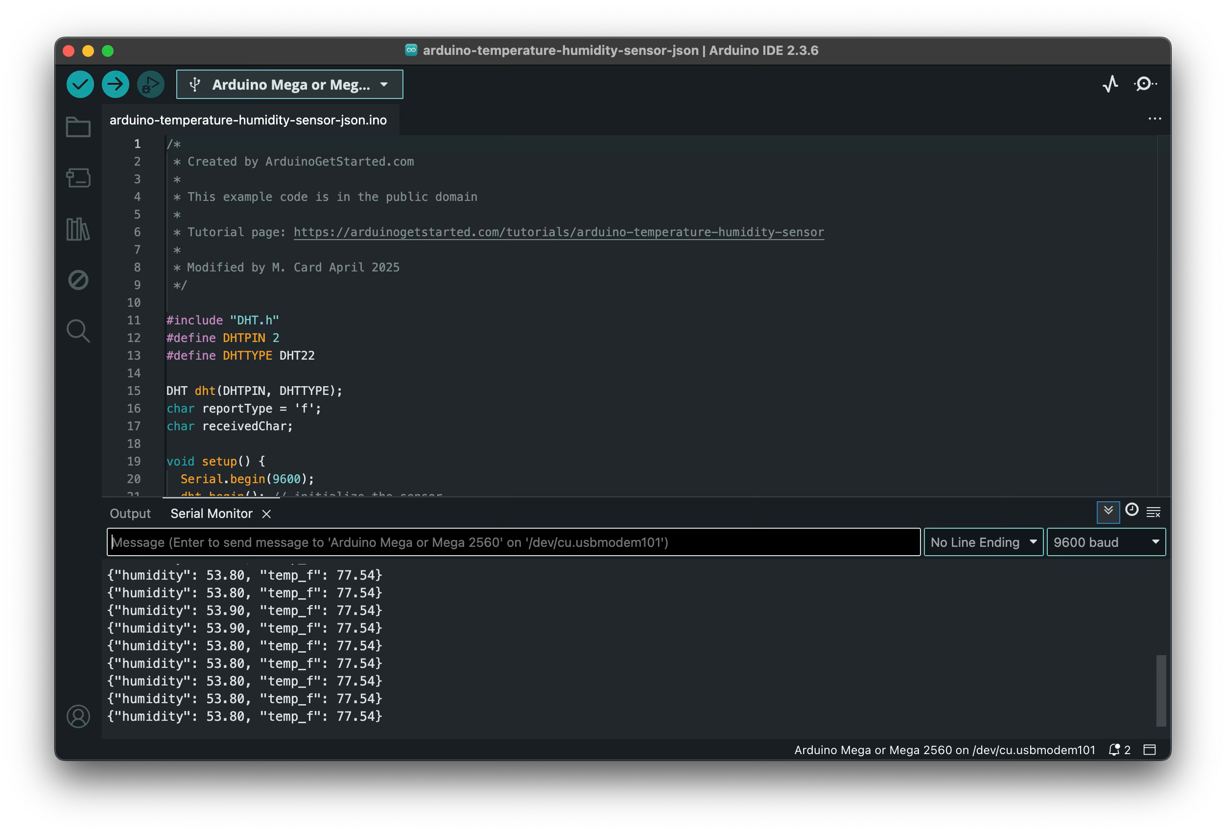 To upload and run the above program on in the Arduino IDE, you would open the repository’s sketches/arduino-temperature-humidity-sensor-json.ino file and click the right-arrow symbol in the upper left corner of the IDE window. When you do the IDE should display something like this: