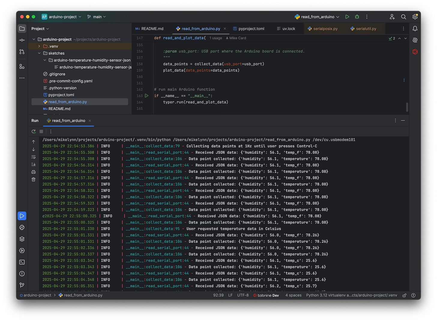 The collect_data function reads the serial port buffer contents and parses them into JSON, adding each data point into the data_points list. This function also reads keyboard inputs, changing the temperature data to the desired temperature scale when c or f are pressed. It will collect data until control-C is pressed, in which case it will return the list of data points it has collected so far. The same thing happens if you are running in PyCharm and the user clicks the req square button to stop execution.