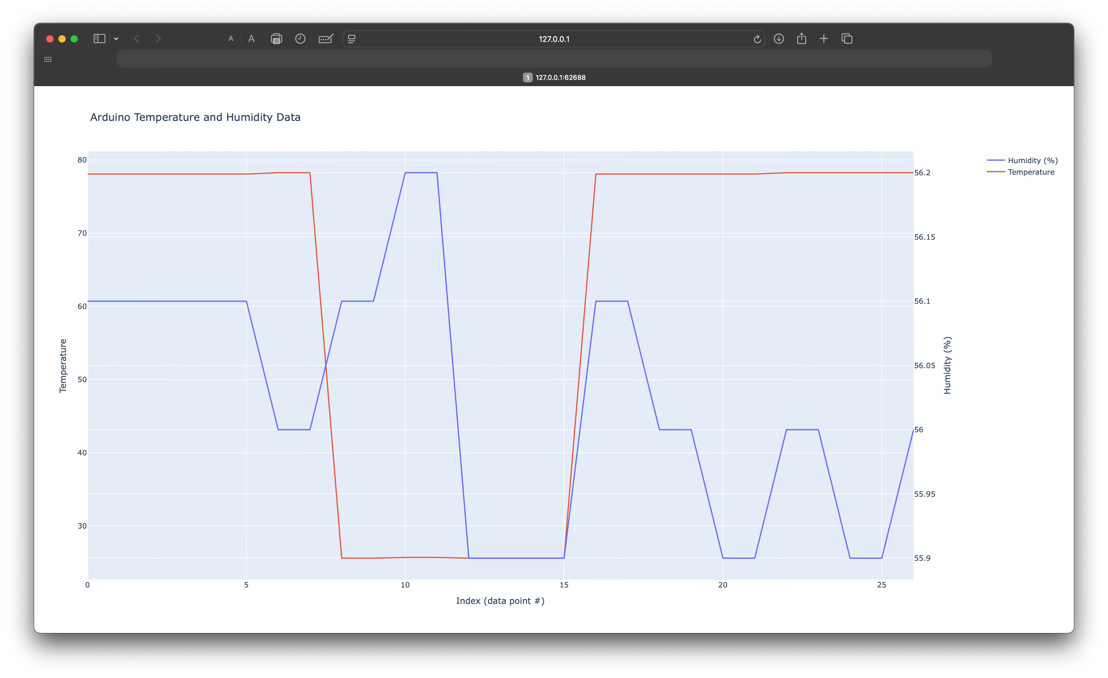 After data collection stops and the collect_data function returns a list of the points it has collected, this list is plotted in the web browser using plotly by the plot_data function. Plotly will plot your data in a page you can view from your browser. The read_and_plot_data function calls both collect_data to get the data and plot_dara to plot it.