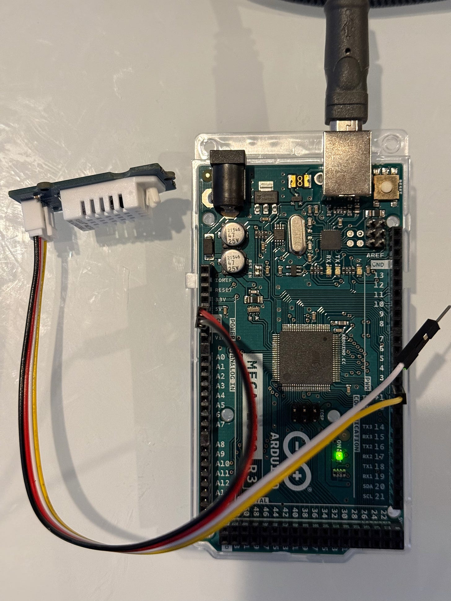 Here the USB cable is plugged into my laptop and the USB-B (box-like) end is plugged into the Arduino Mega 2560 R3 microcontroller which not only provides communication between it and the laptop but also power. As you can see, the cable has a 4-pin connector that is plugged into the socket on the small satellite sensor board and 3 of its 4 pins are plugged into breadboard-style sockets on the Mega microcontroller board. The black and red wires are plugged into the sockets labeled POWER as you can see above, and the yellow wire is the data wire. The data wire can be plugged into any DATA pin, for this example I choose to plug it into data pin 2 (D2).